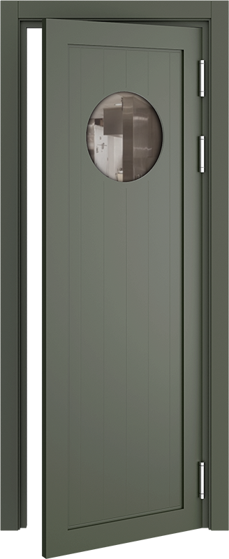 Барные двери актуальны в помещениях с повышенной проходимостью для более удобного доступа персонала к техническим комнатам, например с бара в зону кухни. Часто бывает необходимым, для обзора соседнего помещения, чтобы дверь была остекленная и стилистически оформлена. Стекло толщиной 4 мм круглой, овальной или квадратной формы, на выбор: сатинат светлый, бронзовый, графит или прозрачное стекло. Устанавливается на двери толщиной 40 мм в покрытии Эмаль (любой цвет по каталогу RAL Classic K7) и толщиной 35 мм в ПВХ-покрытиях.